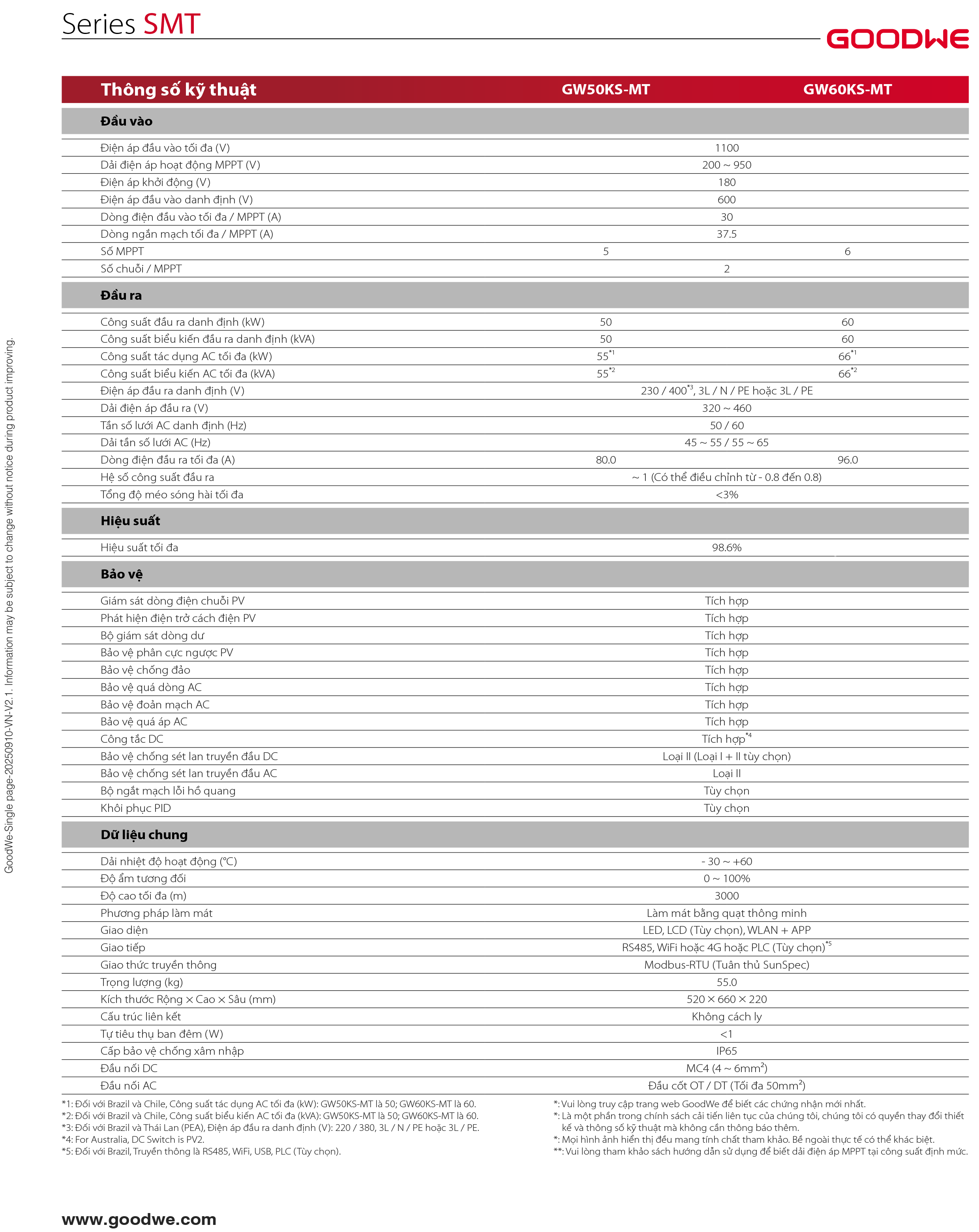 C. Bảng Thông Số Kỹ Thuật Chi Tiết – GoodWe SMT GW50KS-MT 50kW