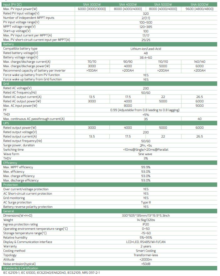 – Công suất PV cực đại đầu vào: 6kWp – Điện áp hoạt động DC: 100-480VDC – Điện áp MPPT range: 120-385 VDC – Số lượng MPPT: 2 – Dòng điện cực đại Mppt: 13A/13A – Điện áp Batt: 48 VDC – Dãi điện áp ắc quy: 40-60 VDC – Đòng sạc tối đa: 100A – Công suất xả tối đa: 5000W ( backup không PV) – Công suất hòa lưới tối đa: 5000W – Dãi tần số: 45-55Hz – Công suất EPS cổng backup: 5000W – Bảo vệ quá tải, ngược cực, chạm đất…….. – Kết nối wifi, monitor, có App cài đặt từ xa trên điện thoại Adroi và IOS – Tiêu chuẩn bảo vệ: Ip20 không chống nước |