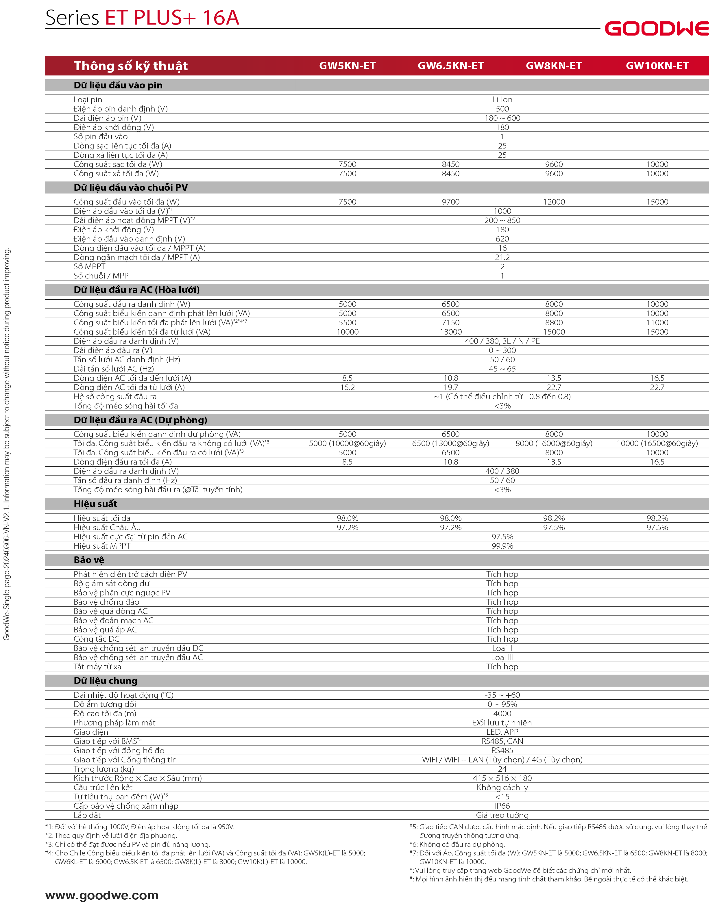 Biến tần hybrid GoodWe ET PLUS+ 16A GW5KN-ET là model 5kW, 3 pha trong series ET PLUS+ (5–10kW),